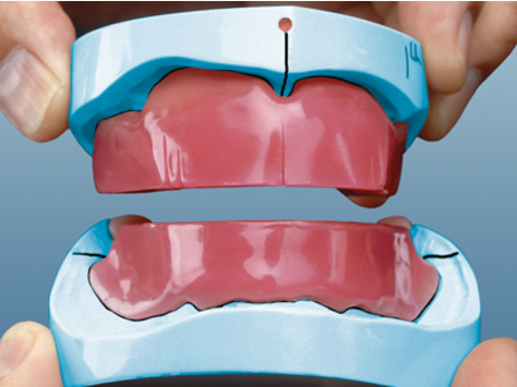 Tijdens de fabricage van de basisplaat moet uw technicus mogelijk ondersnijdingen op het mastermodel blokkeren om breuk te voorkomen. Dit kan resulteren in een enigszins loszittende basisplaat tijdens het passen. In dergelijke gevallen kan een kleine hoeveelheid kunstgebitkleefstof worden gebruikt om de stabiliteit te verbeteren. Nadat de prothese is verwerkt, zal de pasvorm nauwkeurig zijn.